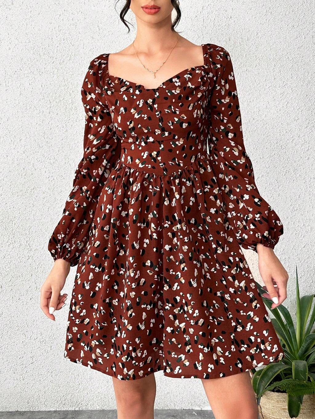 Floral Printed Lantern Sleeve Sweetheart Neckline Dress