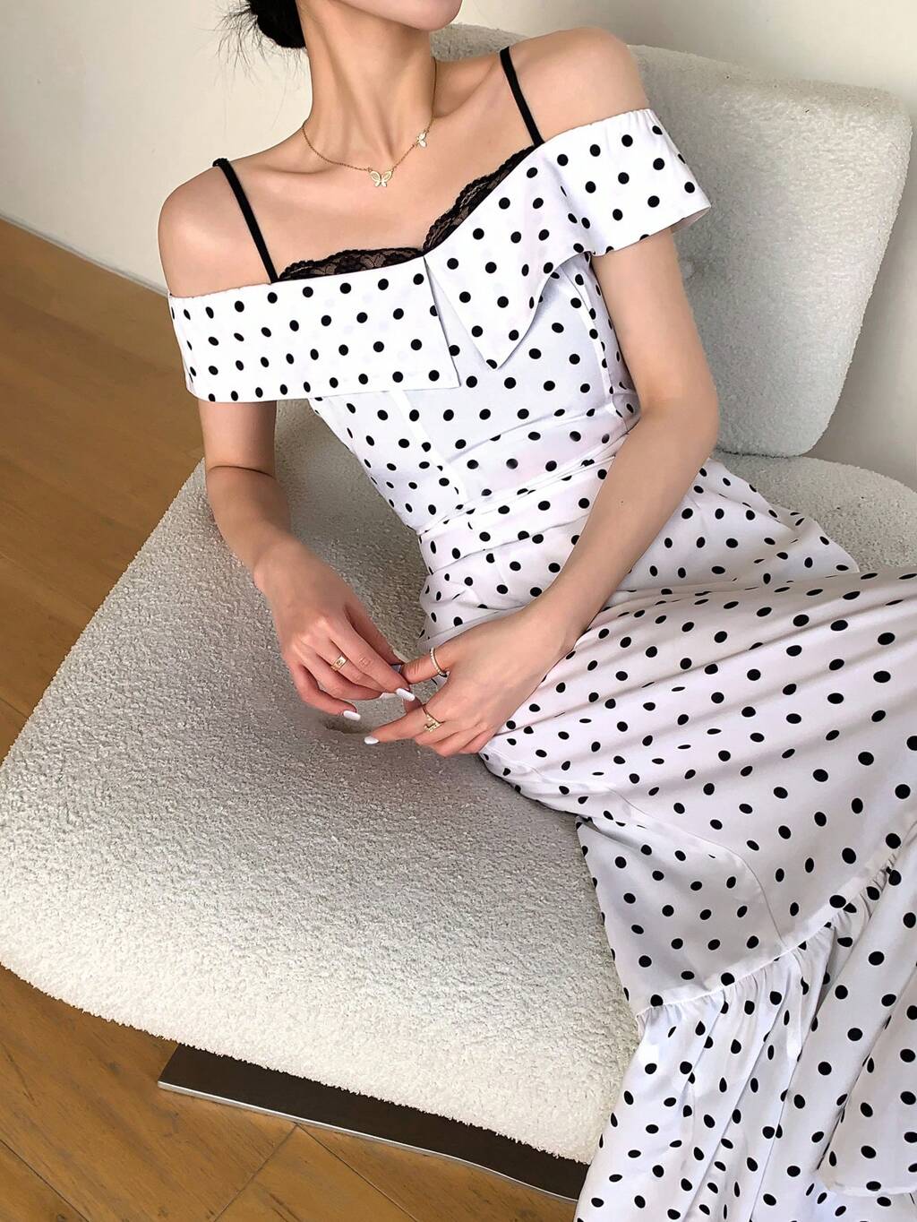 Women's Fashion Lace Polka Dot Open Shoulder Tank Dress