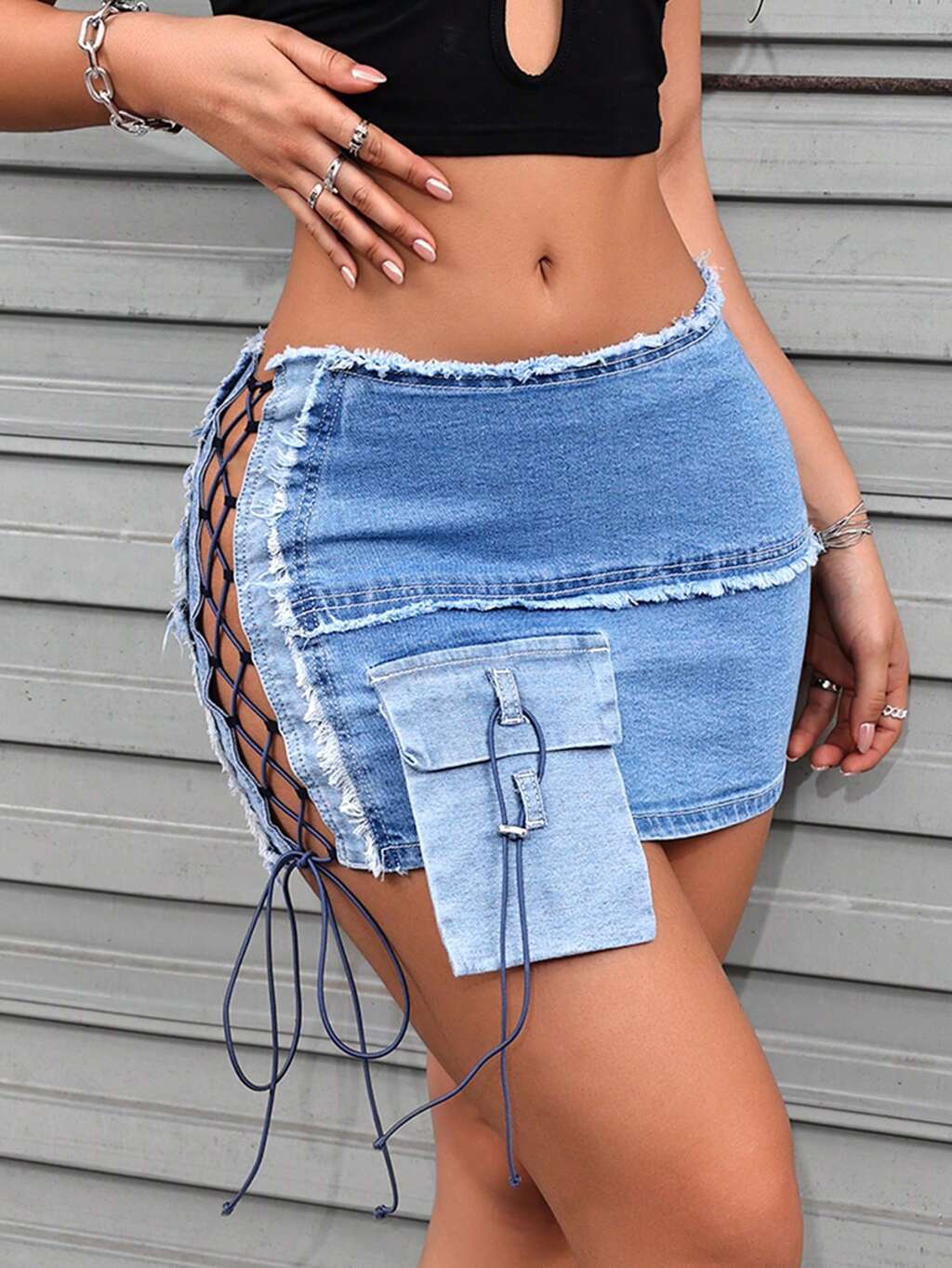 Summer Sexy Hollow Out Side Cross Tied Slim Fit Denim Mini Skirt, Washed