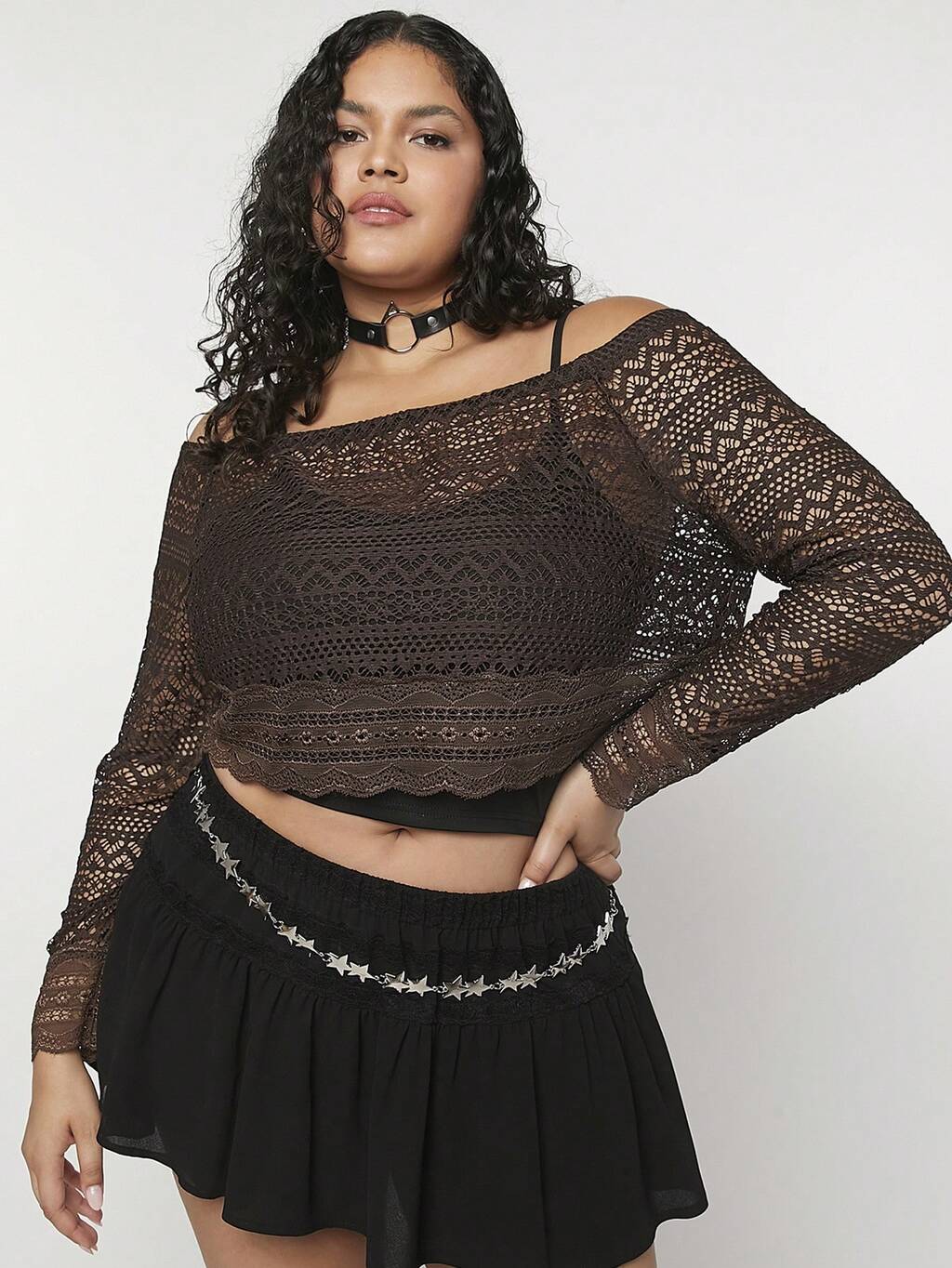 Summer Y2K Music Festival Plus Size Women's Off-Shoulder Long Sleeve Cropped Hollow Out Top