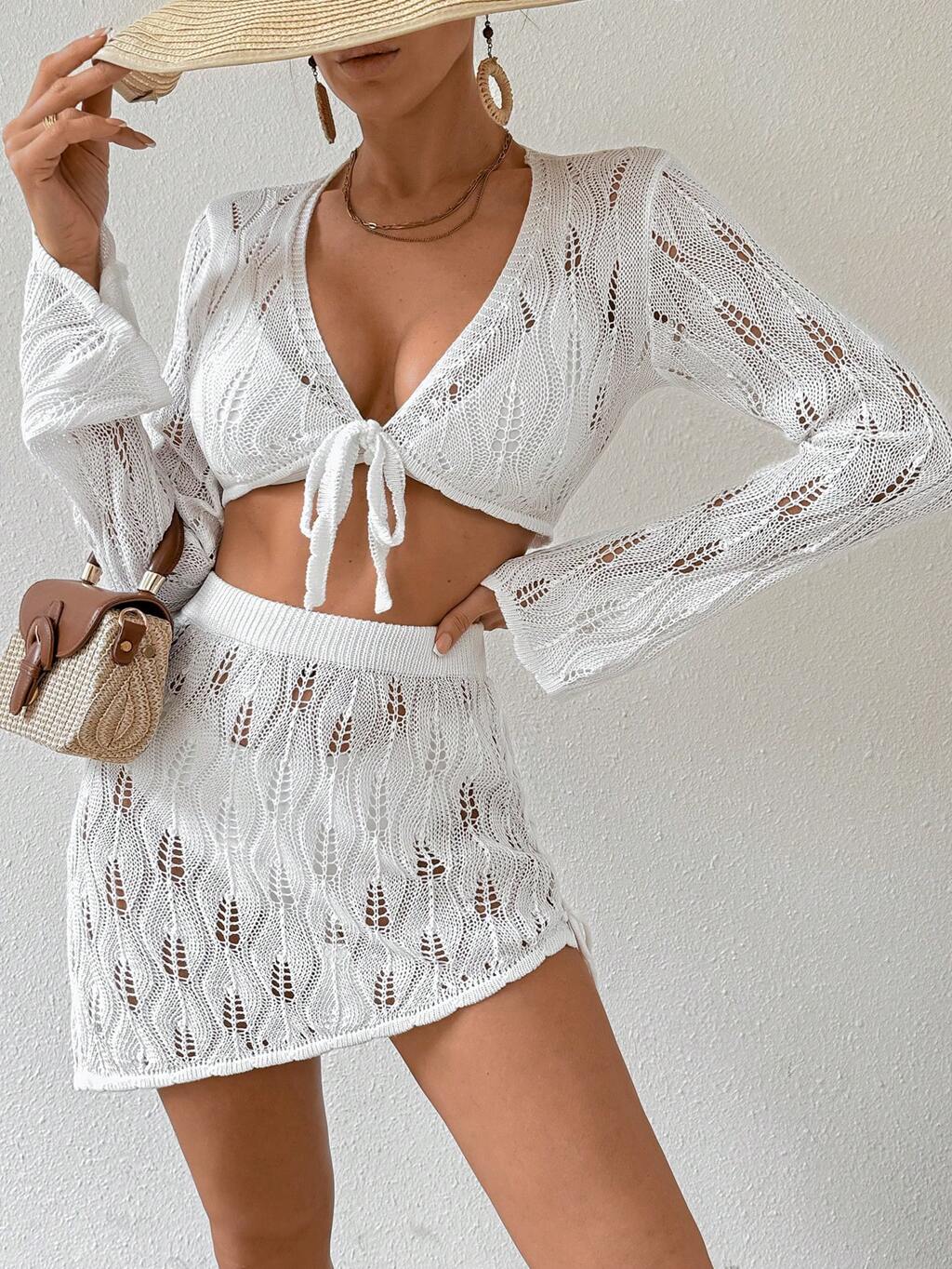 Summer Women Holiday Beach Plain Hollowed Knit Cropped Top And Skirt Cover-Up