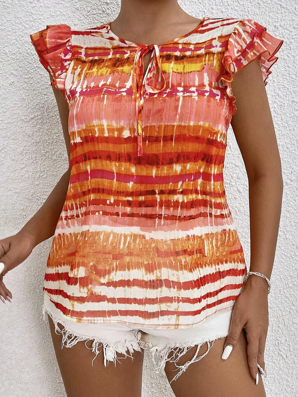 Women's Tie-Dye Printed V-Neck Cap Sleeve Casual Blouse With Bow Tie, Summer