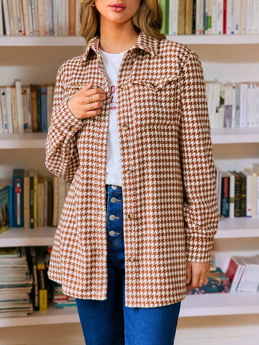 Houndstooth Print Contrast Trim Coat