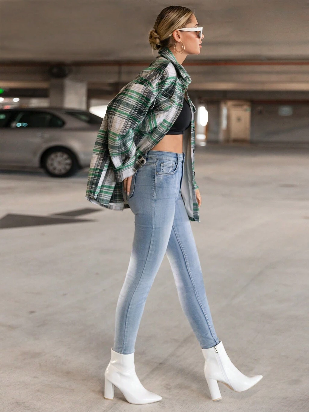 Plaid Print Drop Shoulder Pocket Patched Button Front Coat