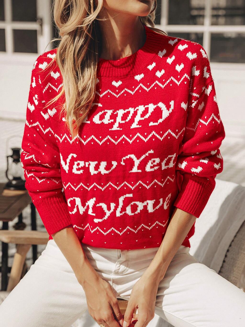 Women's Slogan Patterned Sweater With Crew Neck Knit Pullover Fall Winter Sweater