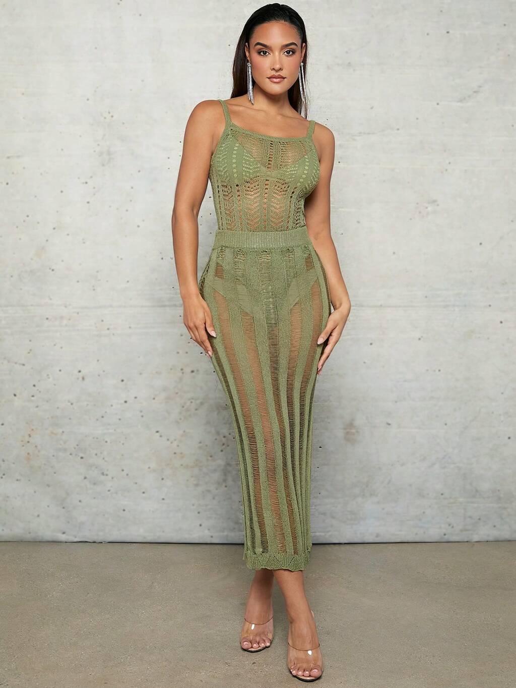 Cover Ups Green Crocheted Spring And Summer Holiday Clothes Hollow Straight Tight Stretch Mid-Length Women's Skirt