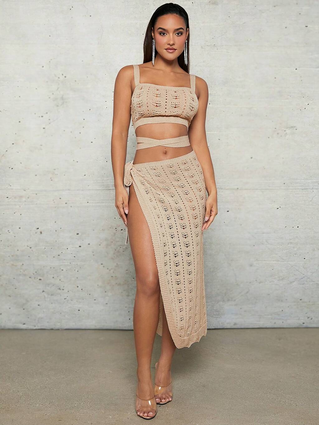 Cover Ups Apricot Crocheted Hollow High Slit Strap Spring And Summer Holiday Clothes See-Through Women's Skirt