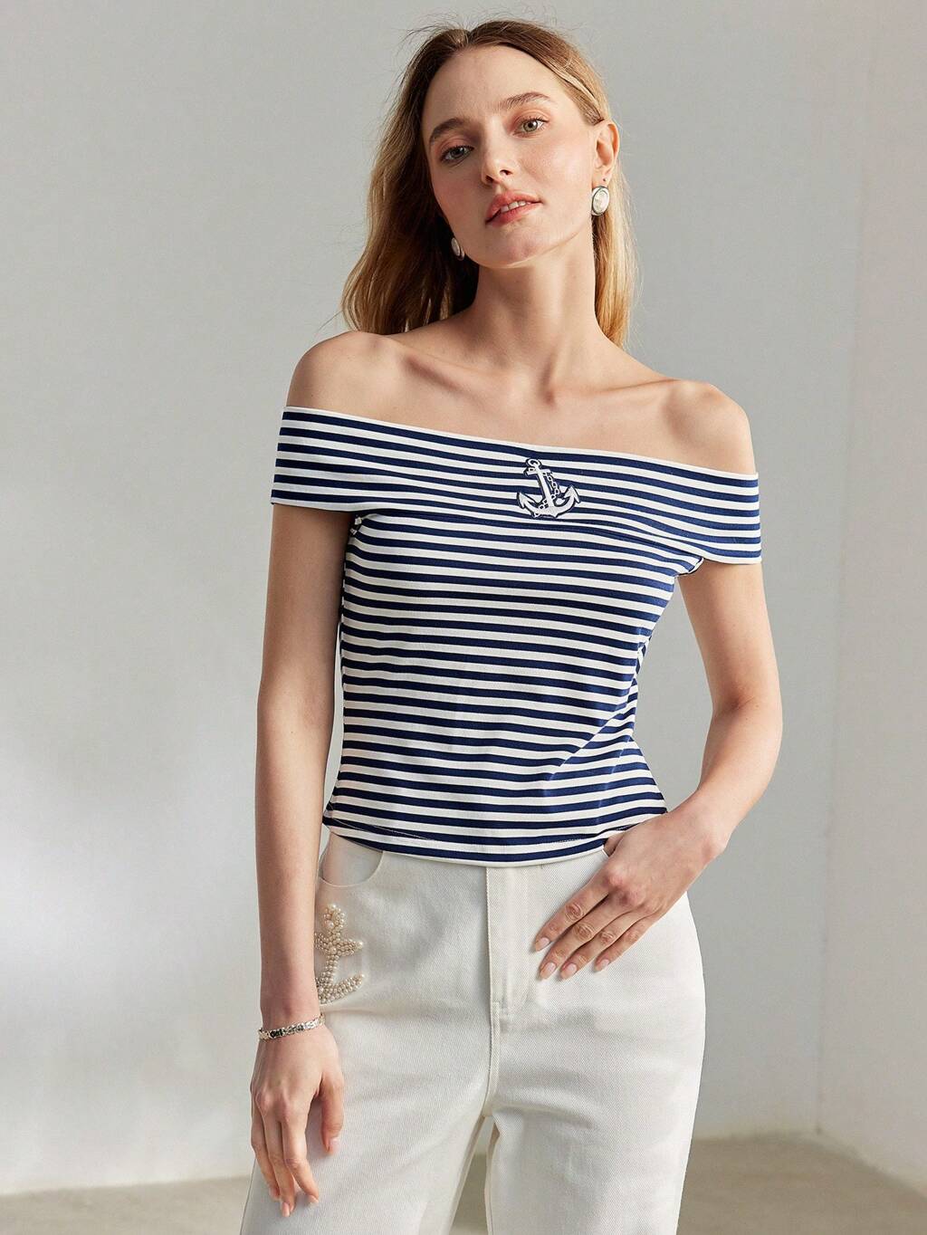 Women's Summer Striped Off-Shoulder Anchor Printed Casual Knit Top