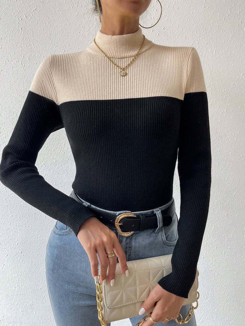 Women's Color Block High Neck Knit Pullover Fall Winter Sweater