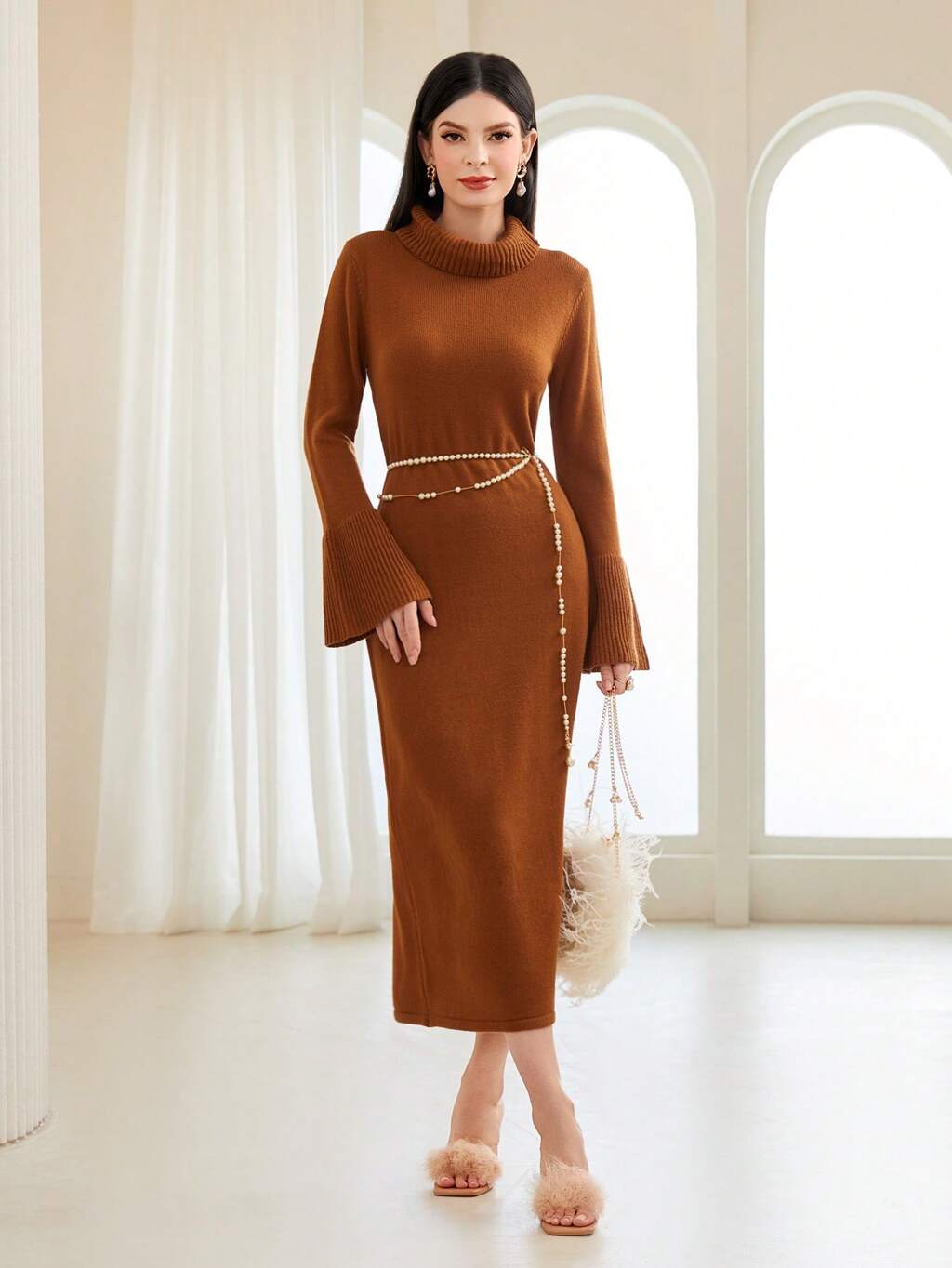 Funnel Neck Flounce Sleeve Sweater Dress Without Belt Fall Cloth For Women