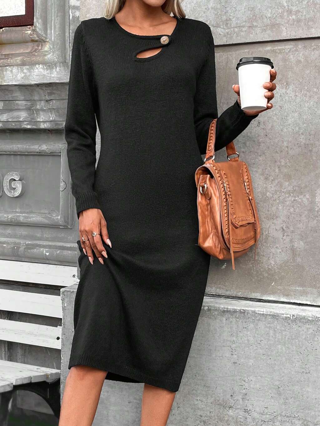Cut Out Button Detail Sweater Dress Fall Cloth For Women