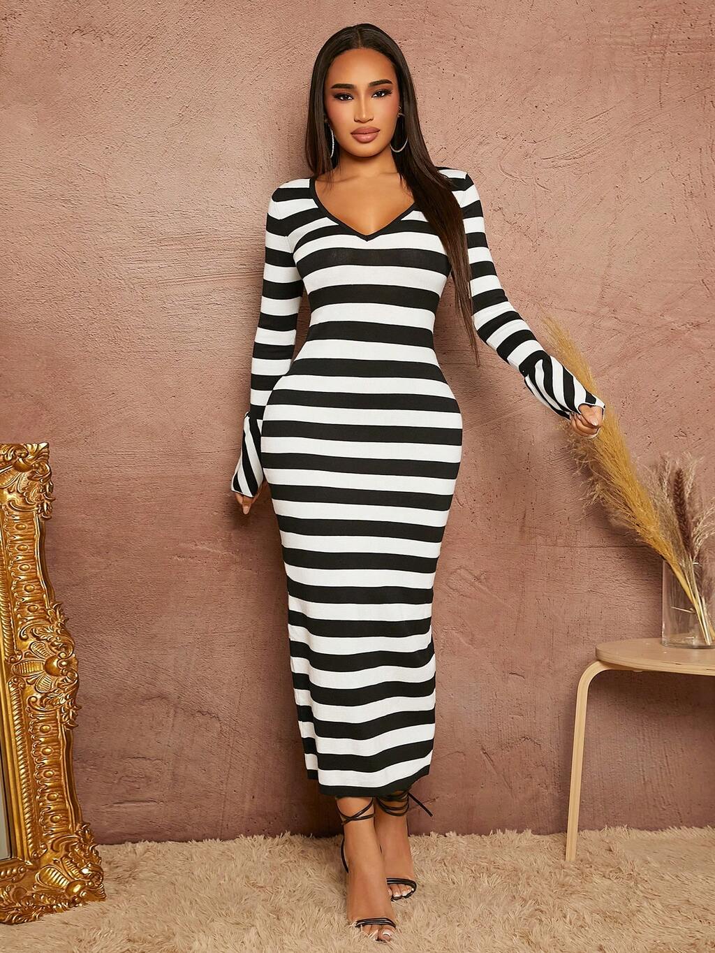 Striped Pattern Tie Backless Bodycon Sweater Dress