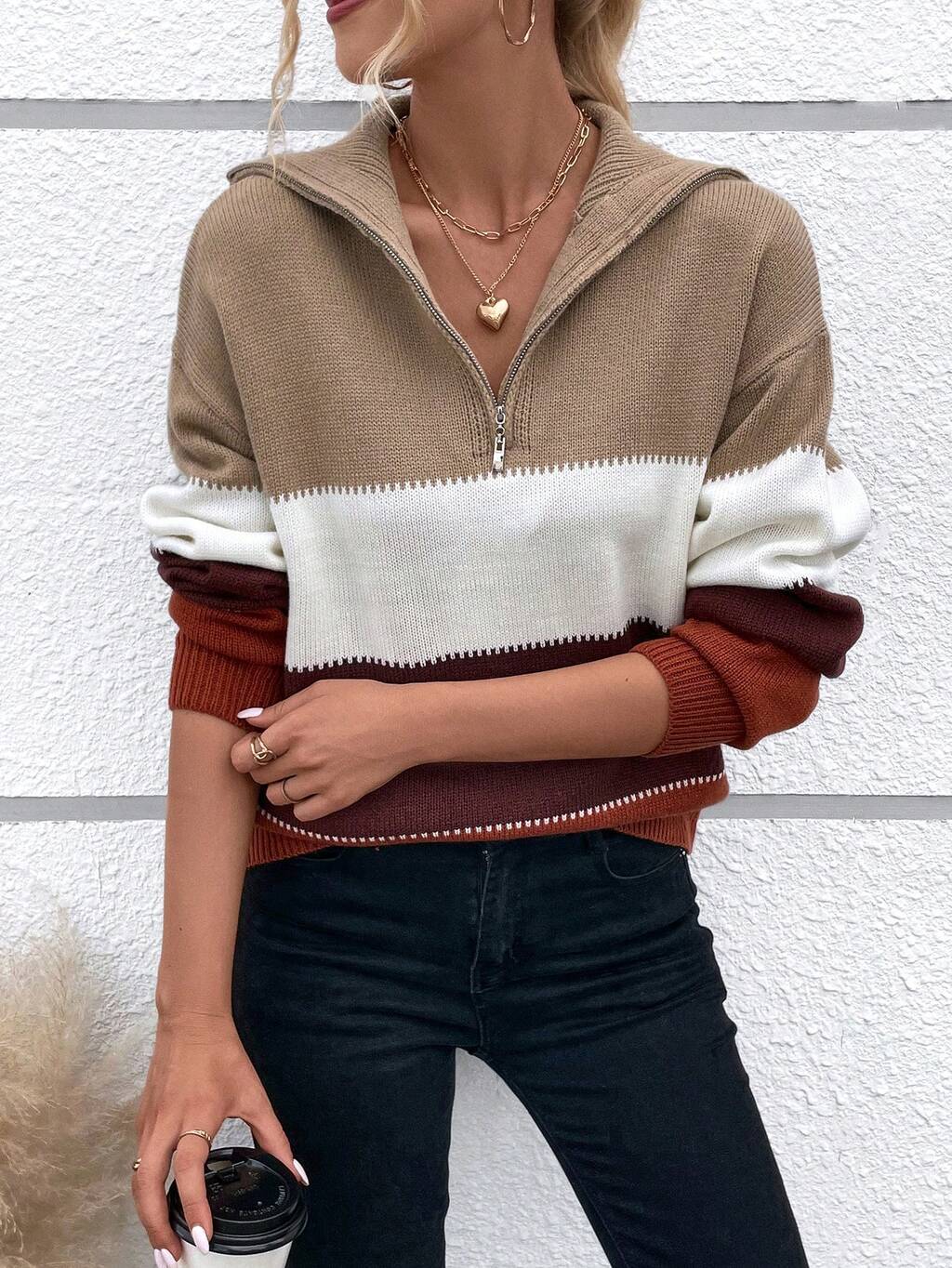 Color Block Drop Shoulder Zipper Front Knit Pullover Fall Winter Sweater