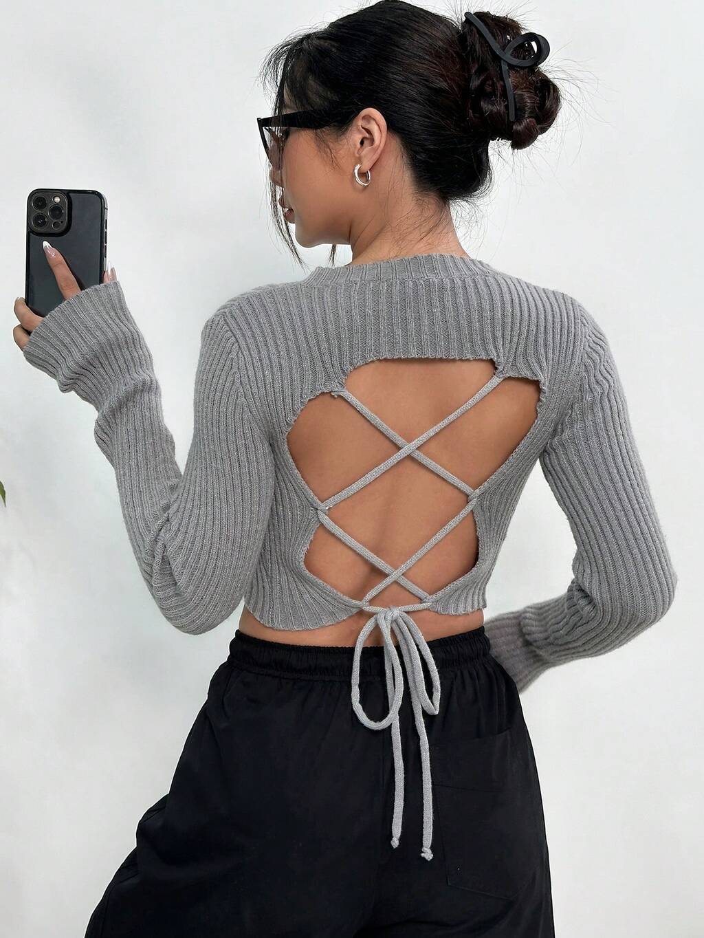 Lace Up Backless Crop Knit Pullover Fall Winter Sweater