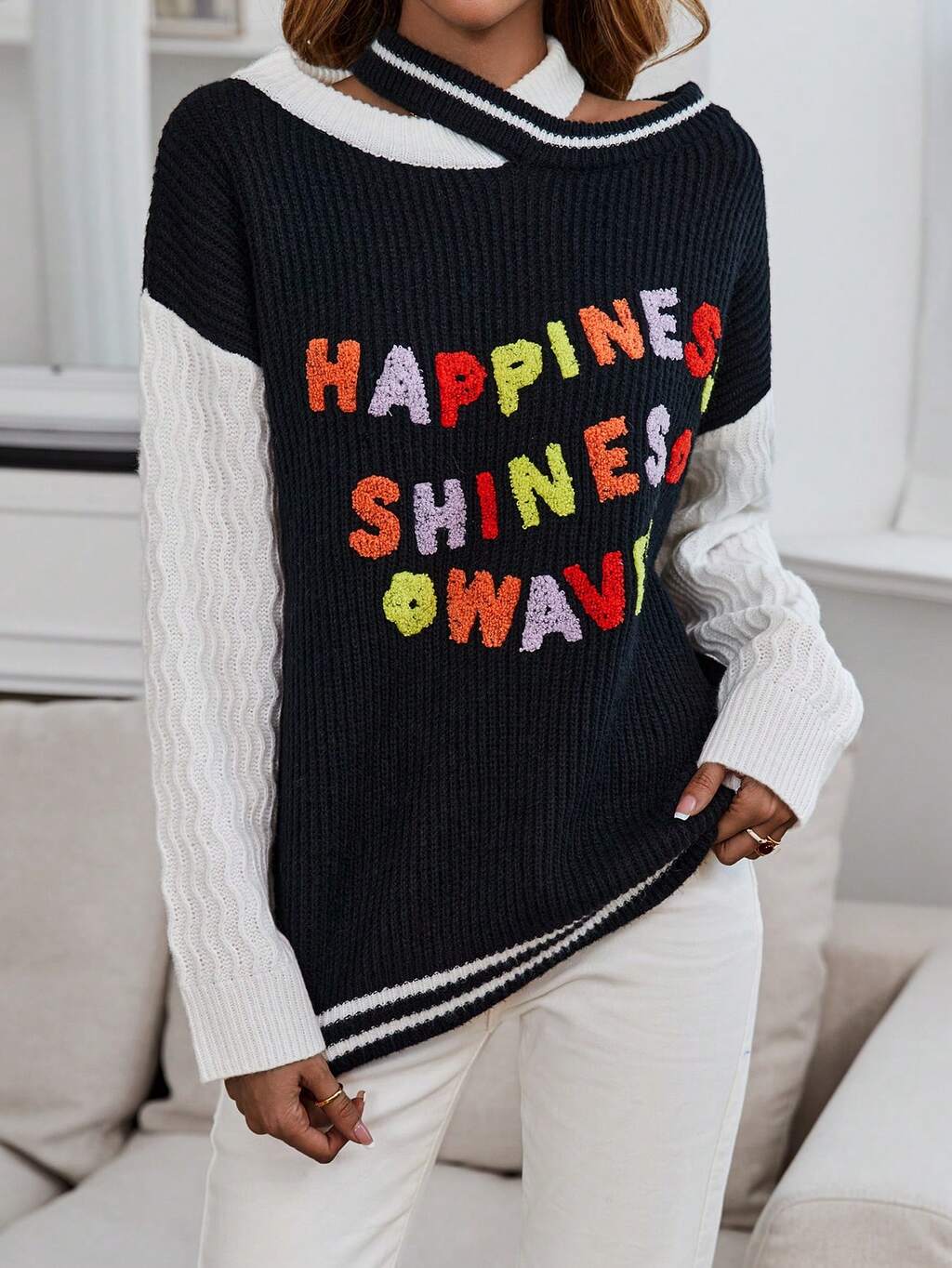 Slogan Graphic Cold Shoulder Sweater