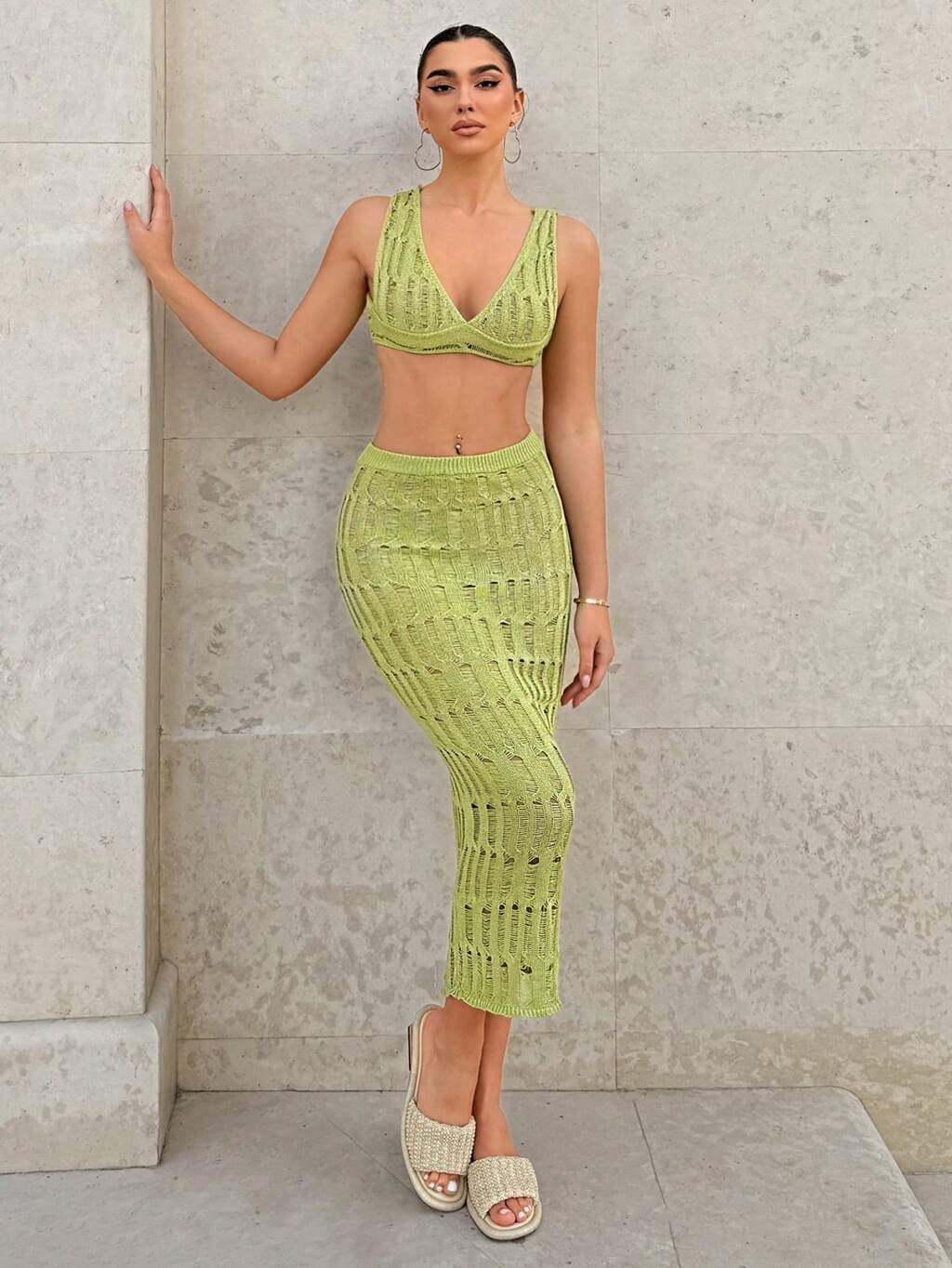 Summer Casual Hollow Out Knitted Cropped Tie Front Top