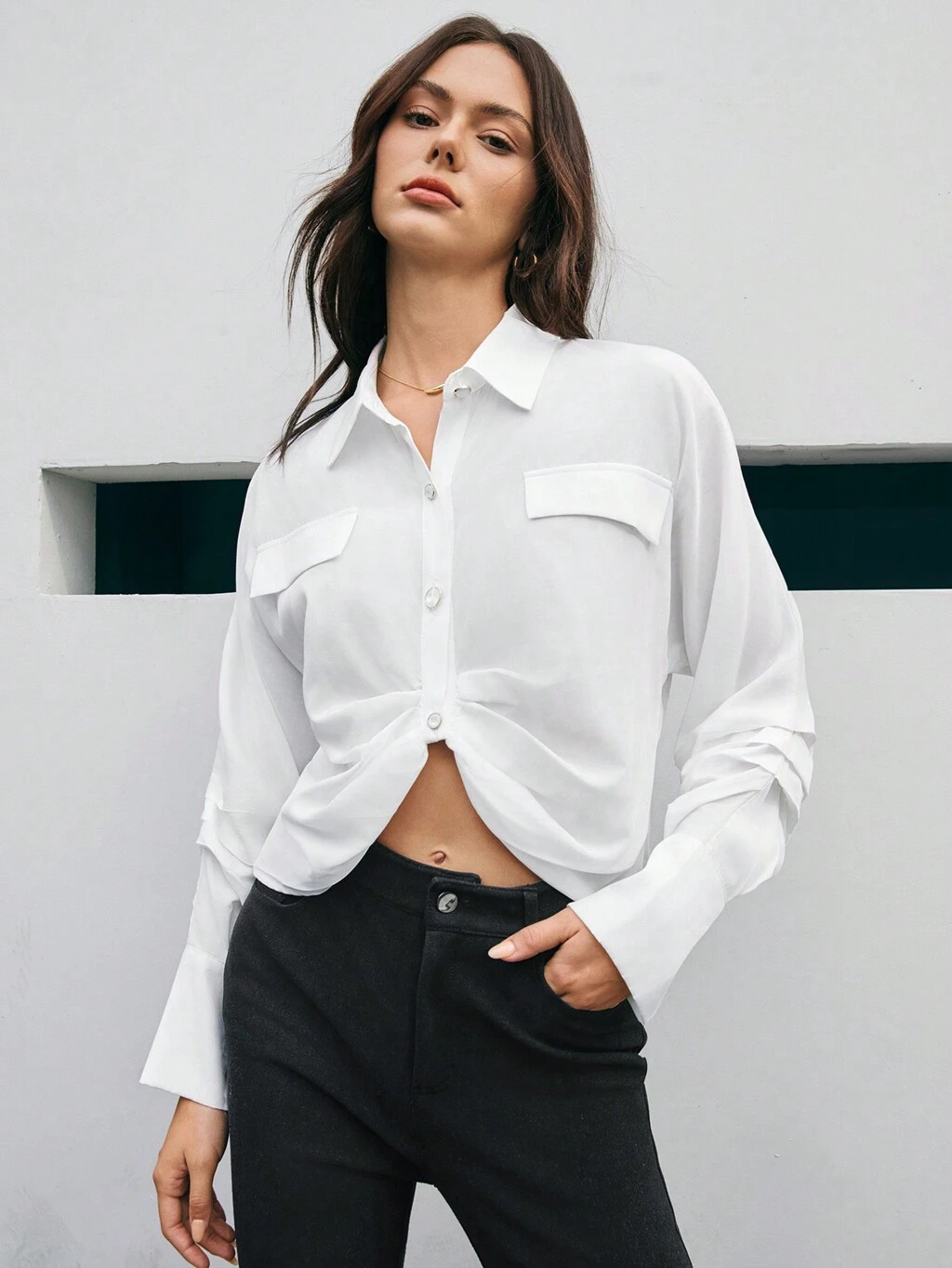Women's Solid Color Flip Detail Curved Hem Shirt Button Up Shirt Fall Cloth For Women