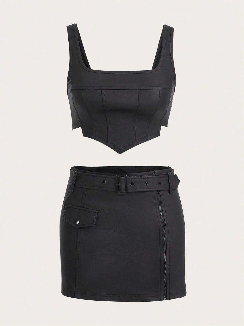 Asymmetrical Hem PU Leather Tank Top & Belted Skirt