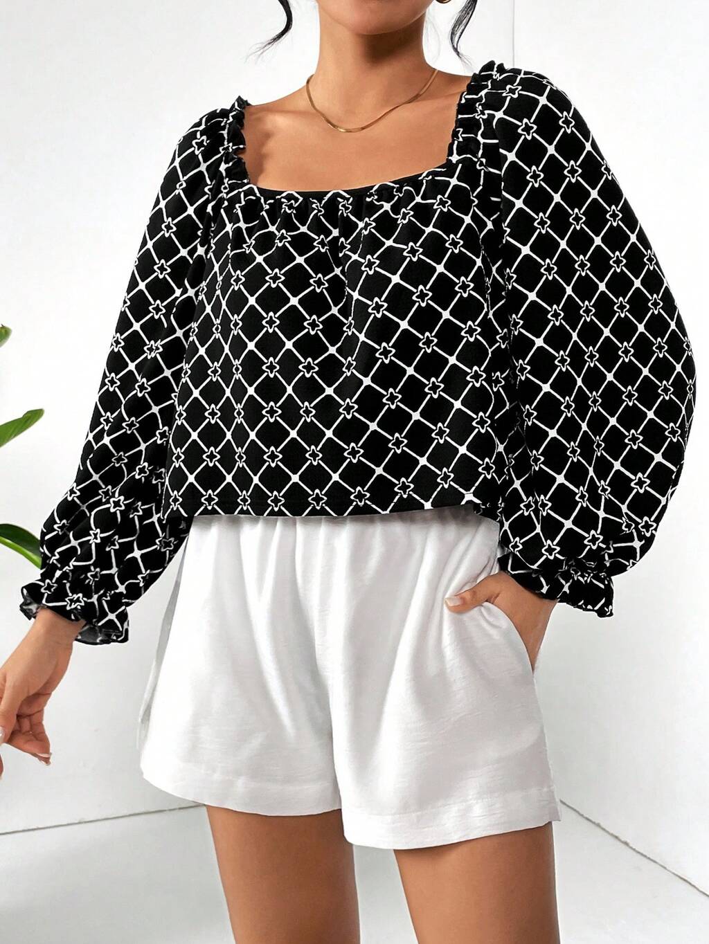 Women's Diamond Grid Star Printed Square Collar Puff Sleeve Shirt And High Waist Wide Leg Shorts Two Pieces Set #Easter
