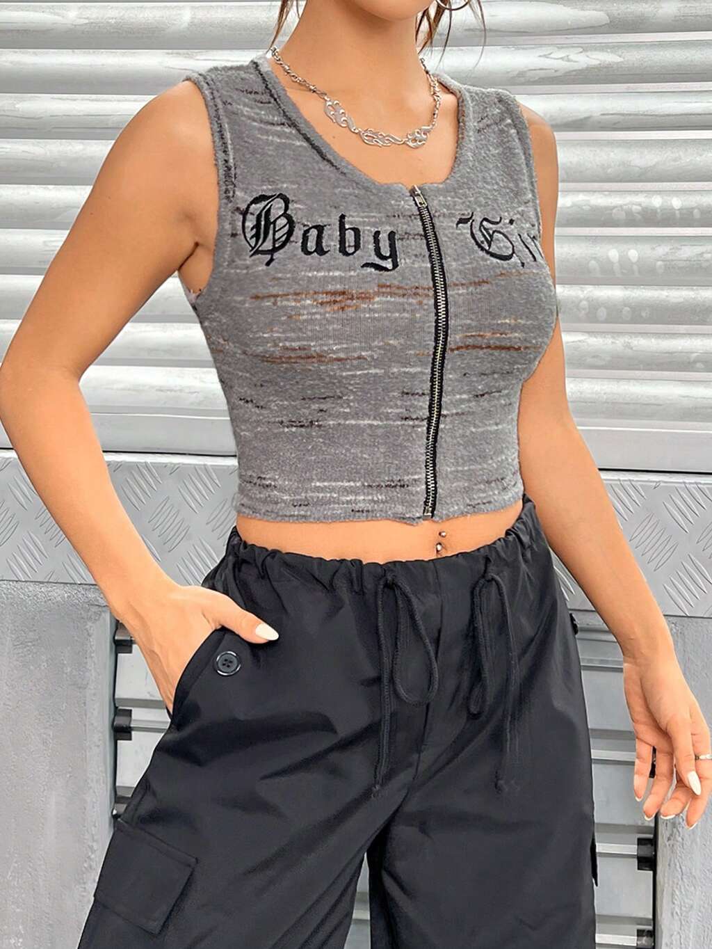 Letter Graphic Zip Up Crop Tank Top