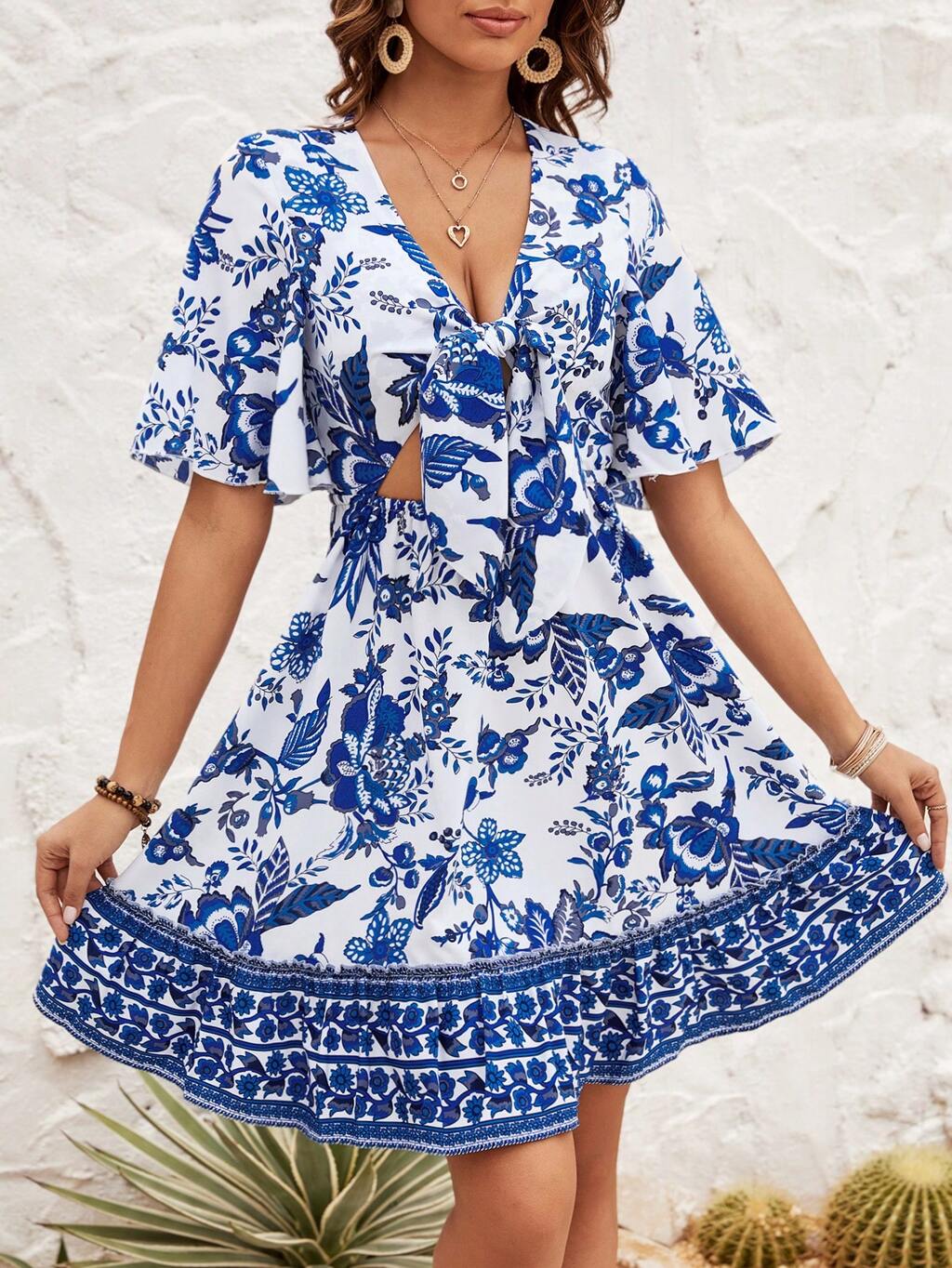 Women's Notched V-Neck Short Cap Sleeve Mini Dress