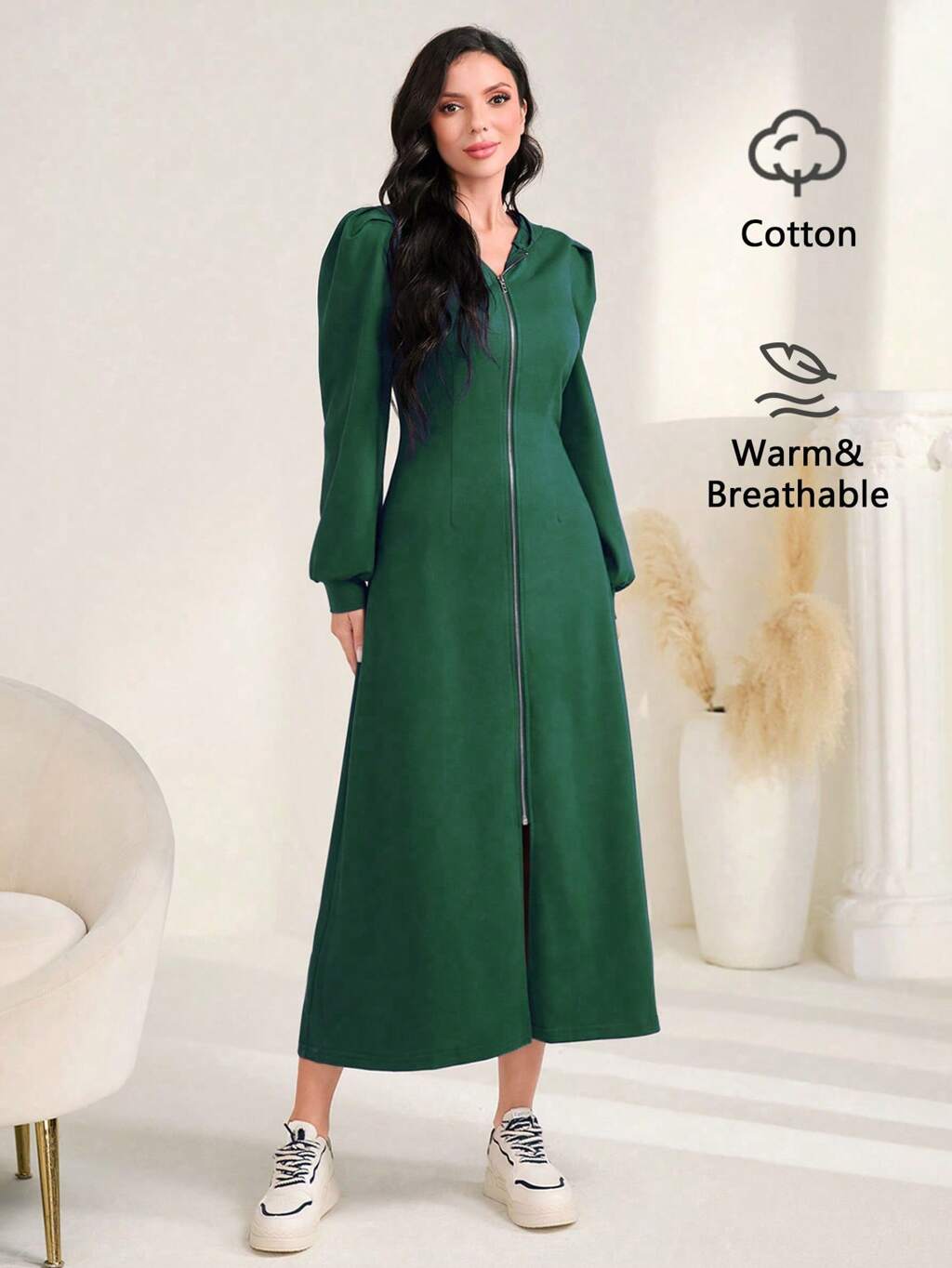 Women's Solid Color Puff Sleeve Zipper Front Dress Fall Cloth For Women