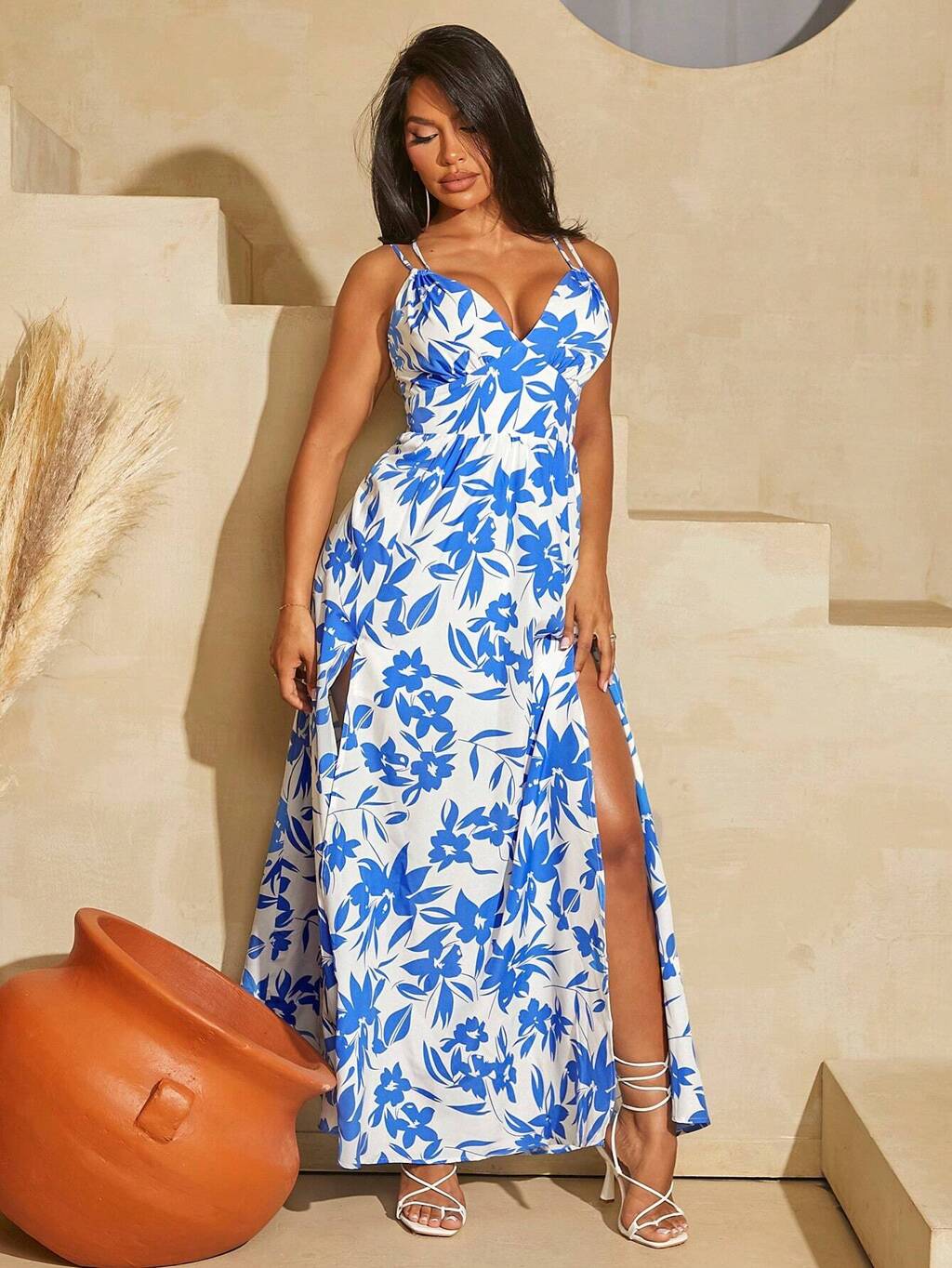 Women's Summer Tie Dye Printed Draped Neck Slim Fit Long Dress With Flared Hem And Elegant Spaghetti Straps