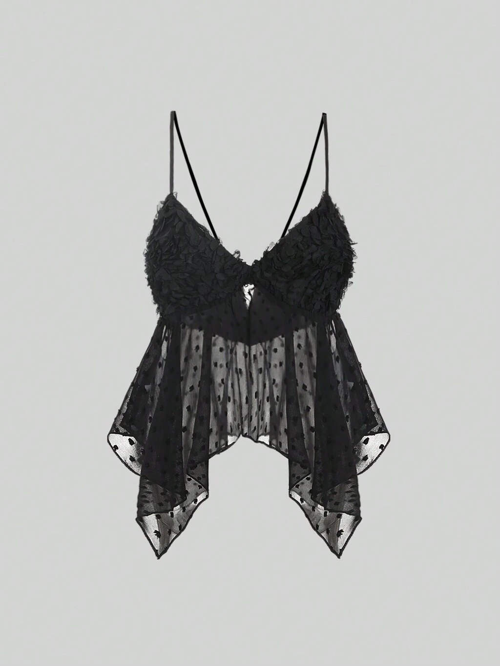 Mesh 3d Flower Splice Swiss Dot Asymmetrical Hem Cami Top