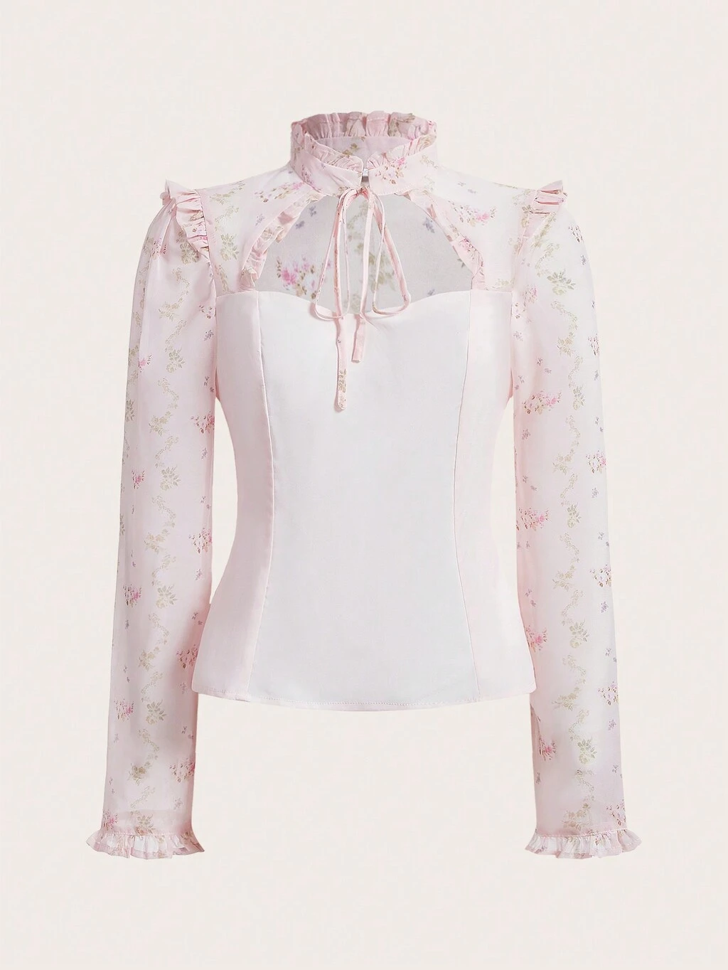 Floral Print Frill Trim Tie Neck Flounce Sleeve Blouse