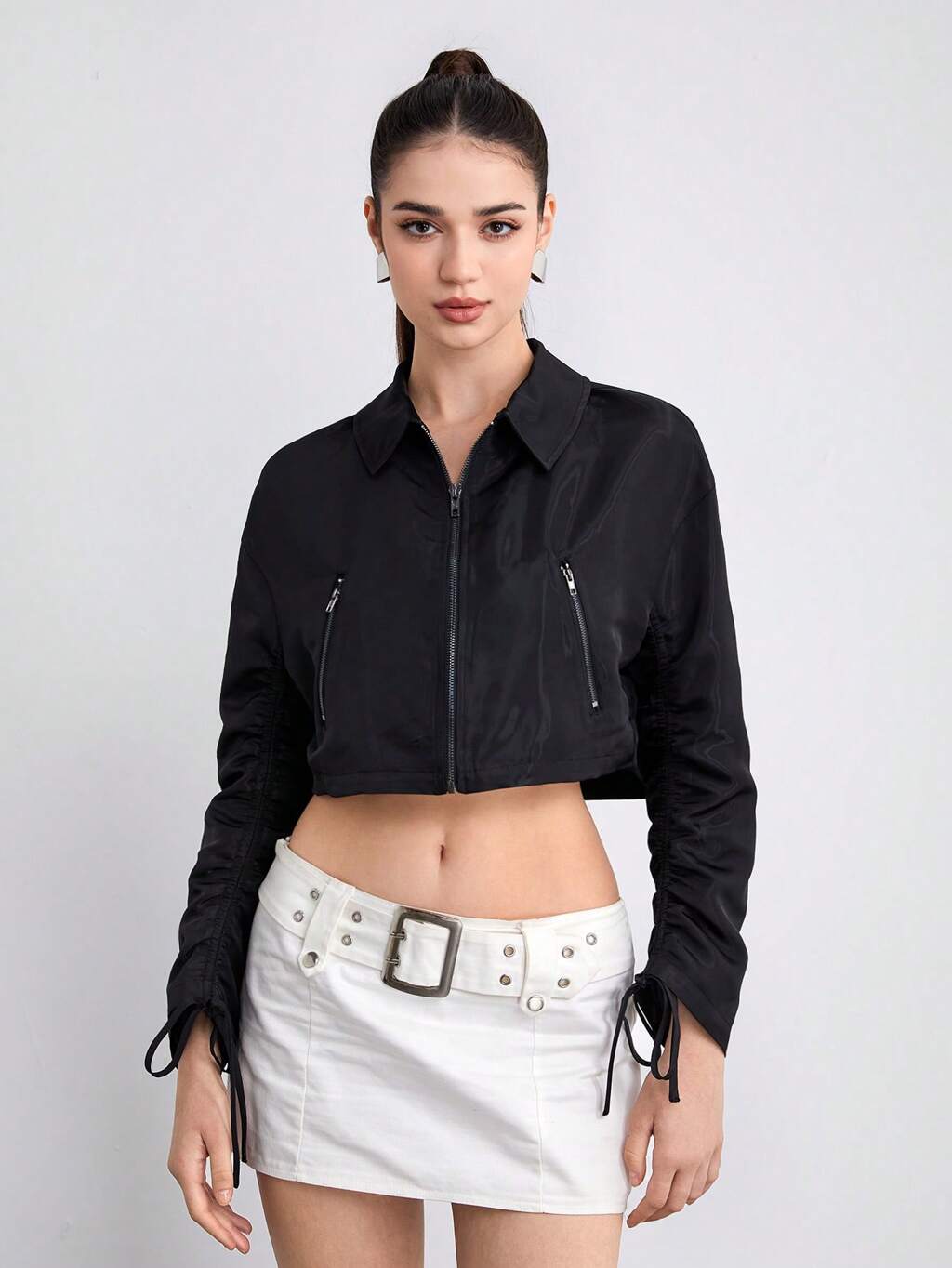 Drawstring Sleeve Zip Up Crop Blouse