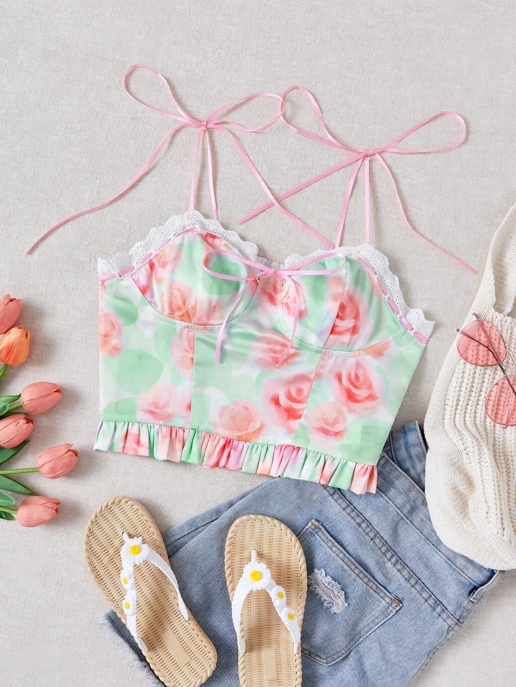 Women's Vacation Style Mint Blue Background Rose Printed Satin Camisole With Ruffle Trim And Tie Shoulder Straps