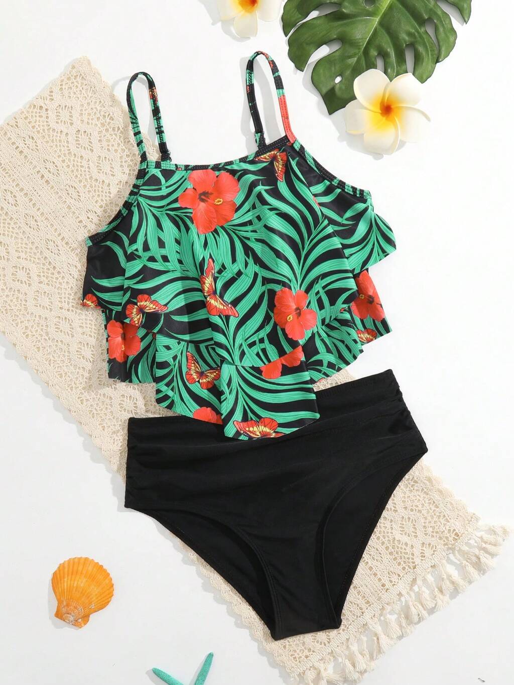 Tween Girl Tropical Print Layer Hem Bikini Set Summer Beach