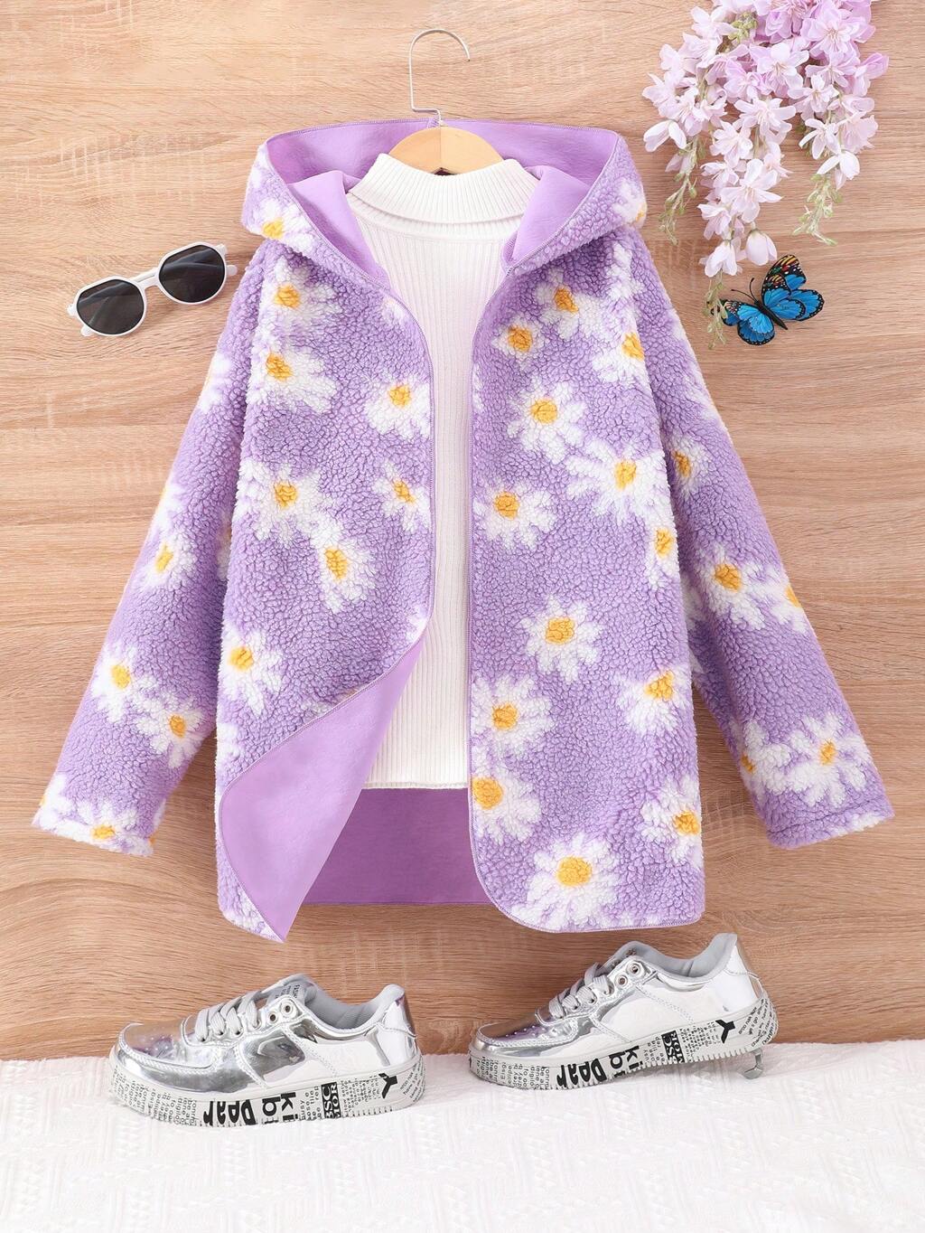 Tween Girl Floral Pattern Hooded Teddy Coat Without Sweater