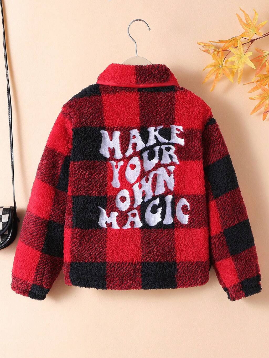 Tween Girl Buffalo Plaid & Slogan Embroidery Teddy Jacket