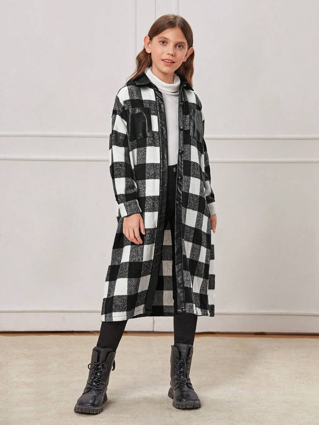 Tween Girl Buffalo Plaid Print Drop Shoulder Pocket Patched Overcoat Without Tee