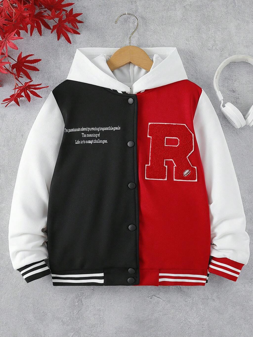 Tween Girl Slogan Graphic Two Tone Striped Trim Varsity Jacket