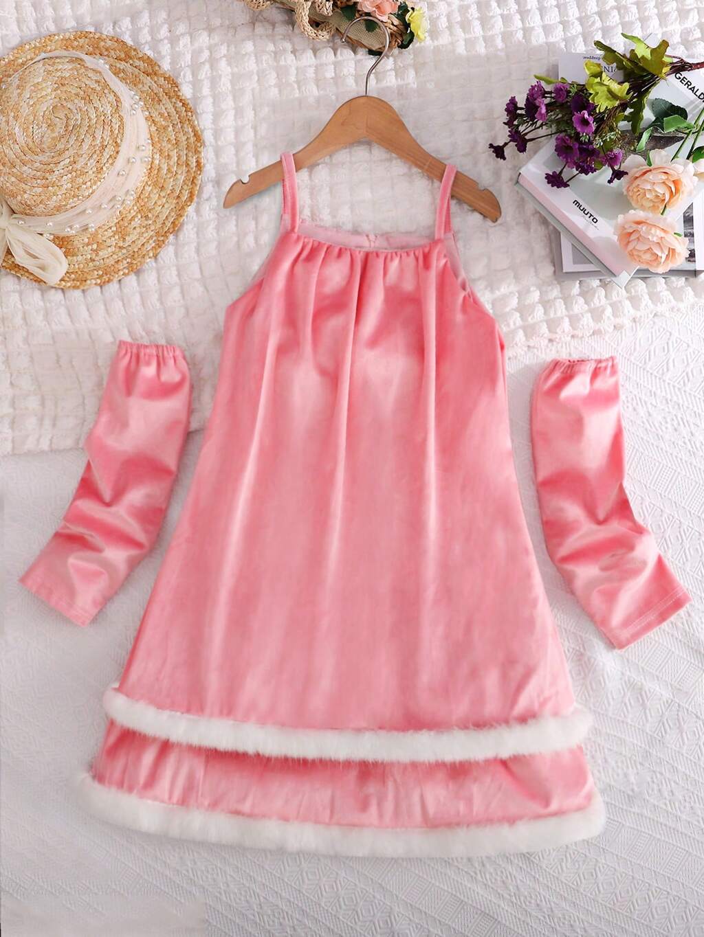 Tween Girl Gorgeous Pink Velvet Long Sleeve Dress With Plush Hem For Autumn