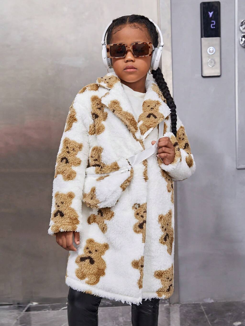 Tween Girl Bear Pattern Lapel Neck Coat With Bag