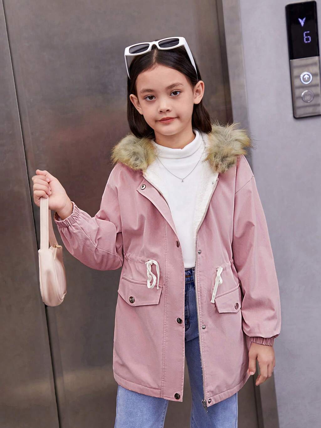 Tween Girl Drawstring Waist Fuzzy Trim Hooded Thermal Lined Coat