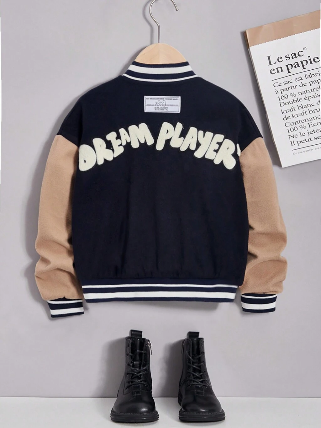 Tween Girl Letter Patched Striped Trim Drop Shoulder Varsity Jacket Without Hoodie