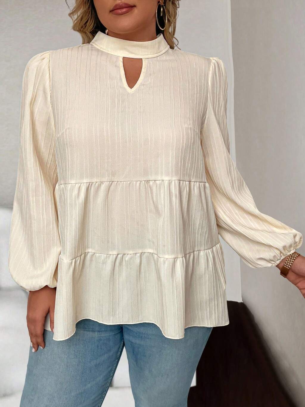Women Plus Size Hollow Out A-Line Casual Beach Top, Khaki Color, Overlapping V-Neckline, Waist Lace Splice With Flounce Hem, Perfect For Summer Holiday And Beach