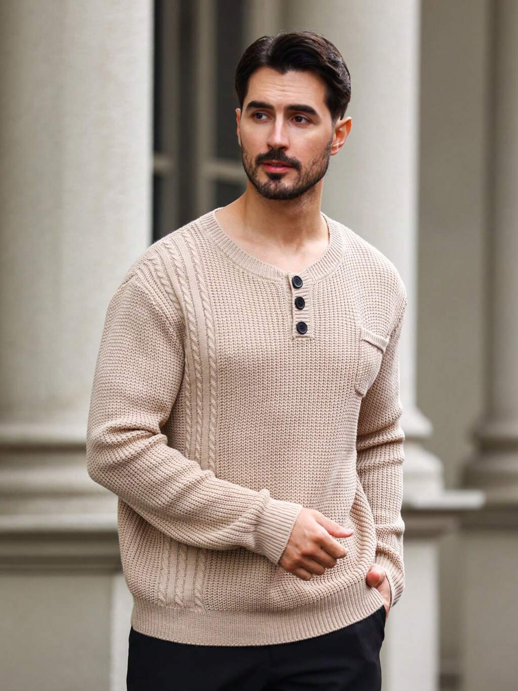 Men's Solid Color Button Decorated Casual Sweater