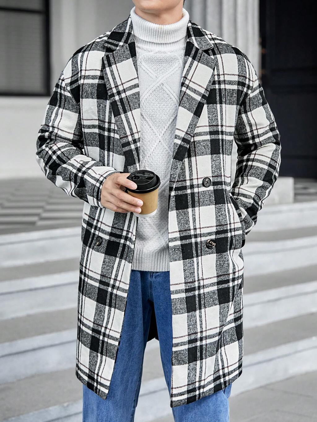 Loose Fit Men's Plaid Lapel Collar Overcoat