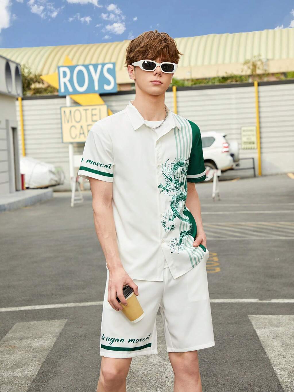Teen Boy Color Block Dragon Print Button Front Short Sleeve Shirt And Shorts Set
