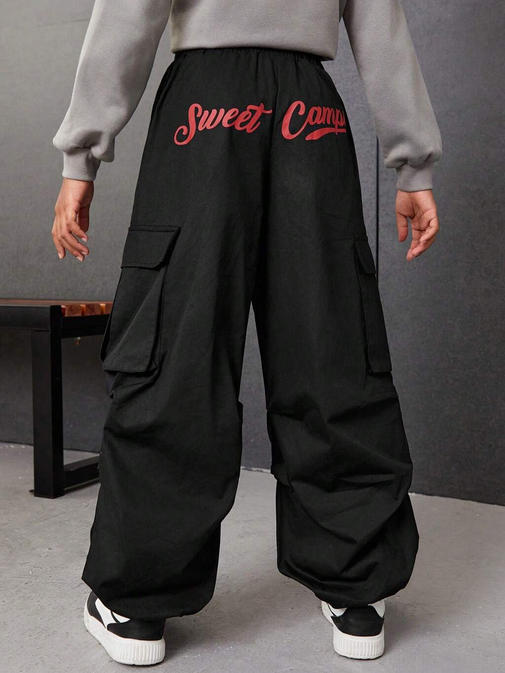 Tween Girl Letter Graphic Flap Pocket Side Parachute Pants