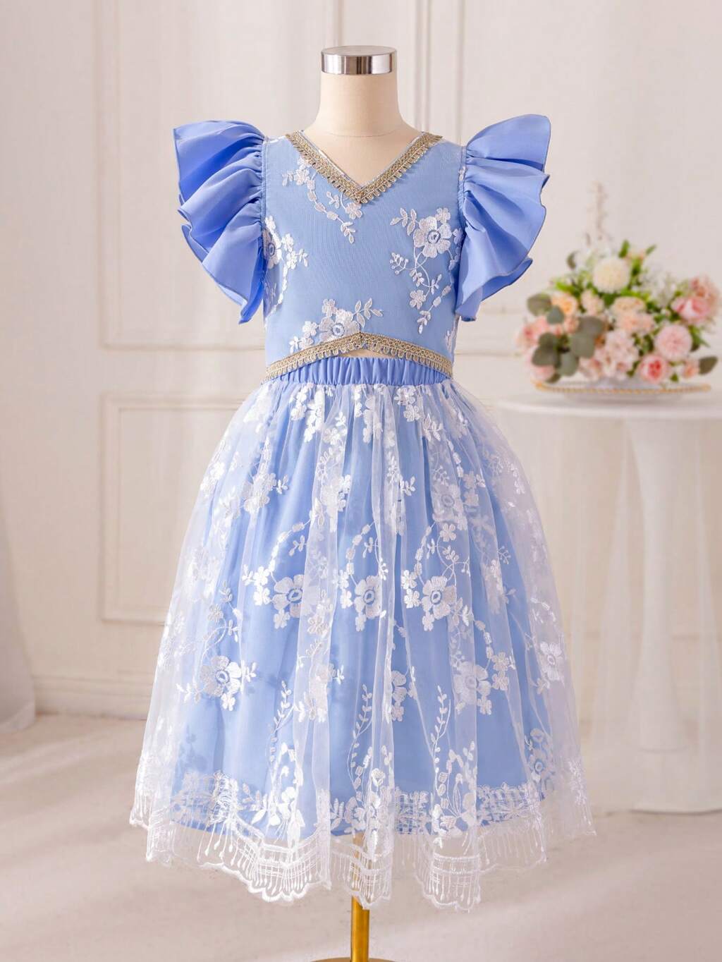 Tween Girls' Round Neck Dress With Lace Decorated Ruffle Sleeve And Hemline, Gold Foil Detailing