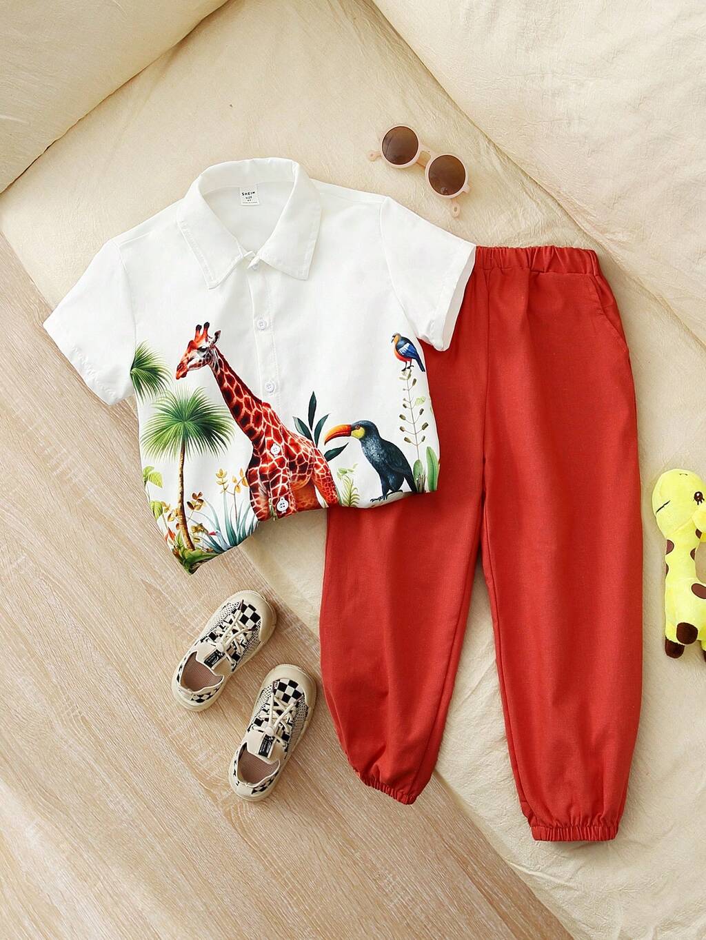 Toddler Boys' Comfortable Animal Pattern Printed Short Sleeve Shirt With Solid Color Elastic Waist Pants Outfit For Casual Wear
