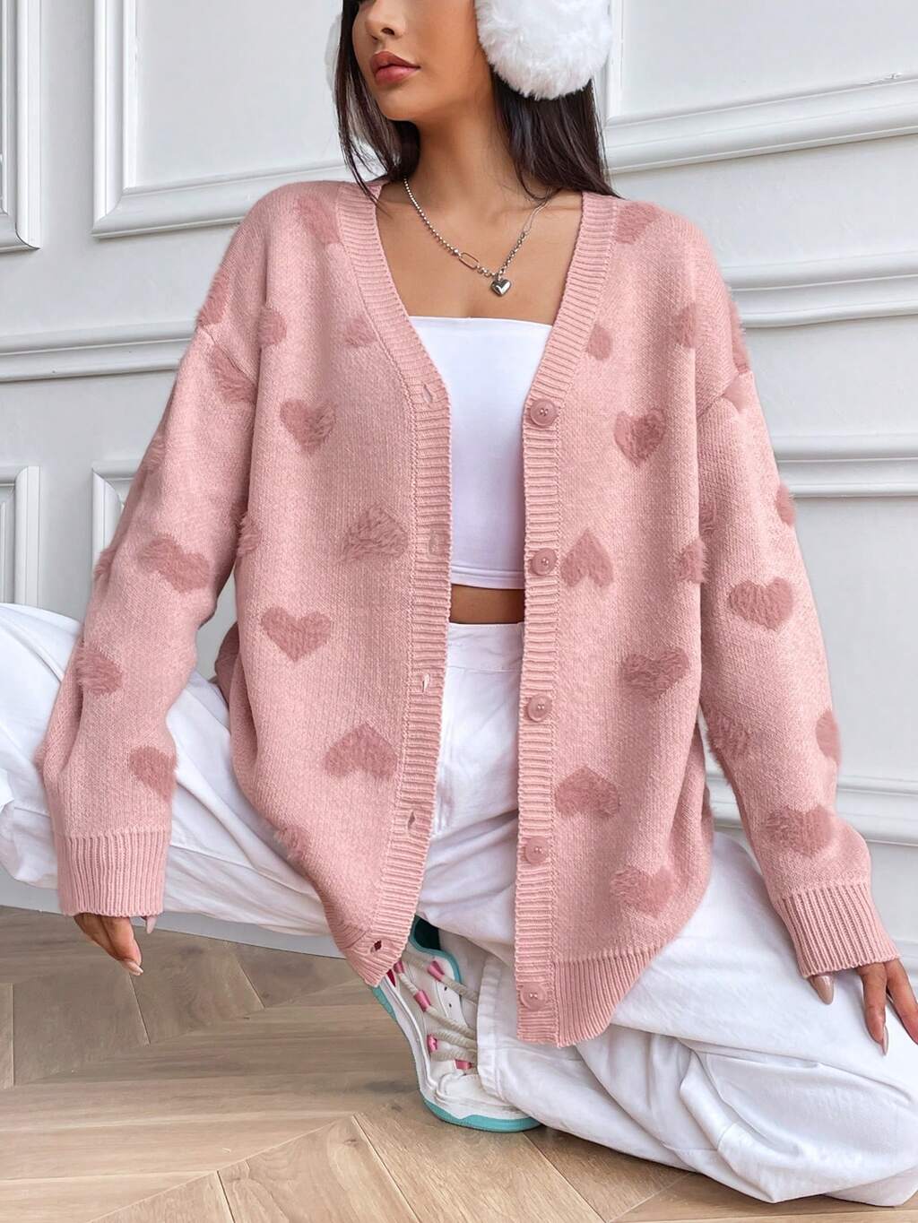 Casual Loose Front Button Heart Decor Long Sleeve Women Cardigans