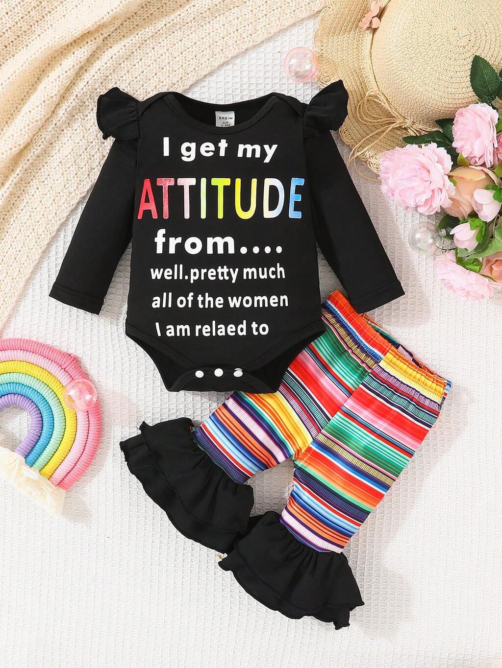 Baby Girls' Slogan Printed Ruffle Collar Bodysuit With Striped Flared Pants Set