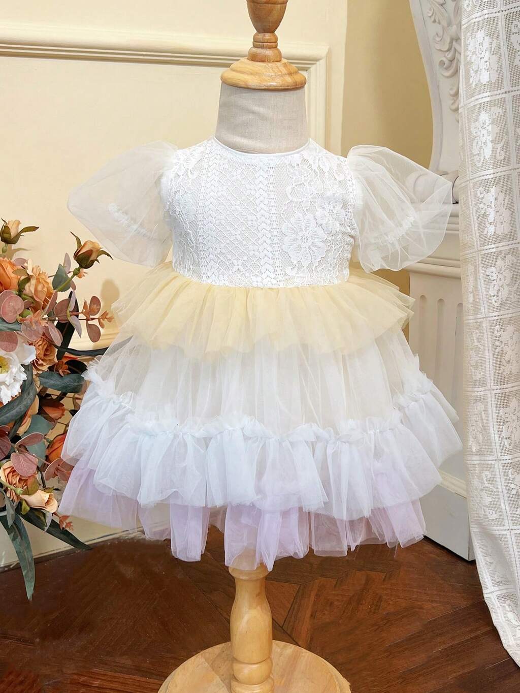 Baby Girl Lace Tulle Ruffle Hem Dress With Puff Sleeves